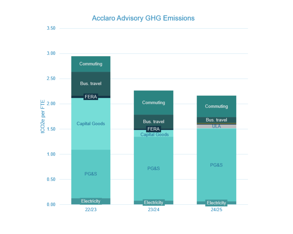 Our total carbon emissions for Financial year ending April 2023 totalled 39.15 tonnes, a 103% increase in comparison to the year previous. Our emissions per FTE have also increased by almost 100%. The majority of this emissions increase can be attributed to Acclaro’s move into a new office and the one-off capital expenditures associated with this move and their resulting emissions. The remainder of this increase is taken up by a large increase in business travel due to two members of staff taking intercontinental business flights which is a rarity for the business. It is anticipated that Acclaro’s emissions for the past year will be anomalous.